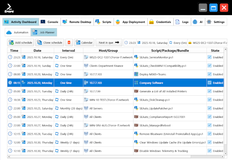 Schedule to run a single Script, a sequence of scripts aka. Package or deploy software Bundles